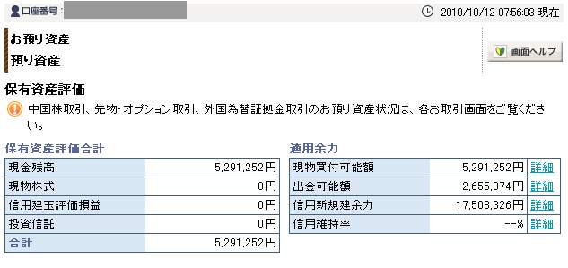 10月12日口座残高 5,291,252円